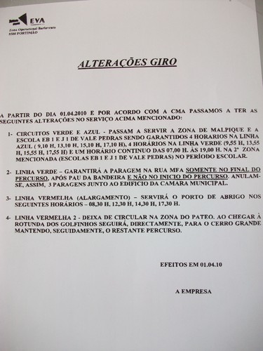 A retirada do vermelho 2 do Páteo, fazendo-o arrepiar caminho na rotunda dos golfinhos, não beneficiou ninguém. NINGUÉM. Mas prejudicou muita gente. Desde logo, os idosos - que não são poucos! - que se deslocam ao Centro de Saúde (CSA). Antes iam directos e a horas de tirar senha para consulta ou tratamento. Agora, ou fazem parte do percurso a pé, para apanhar o "2", ou, seguindo no "1", vão chegar ao CSA muito mais tarde, quando o autocarro regressa ao Páteo, depois de ter passado pelo Terminal e iniciado novo percurso.